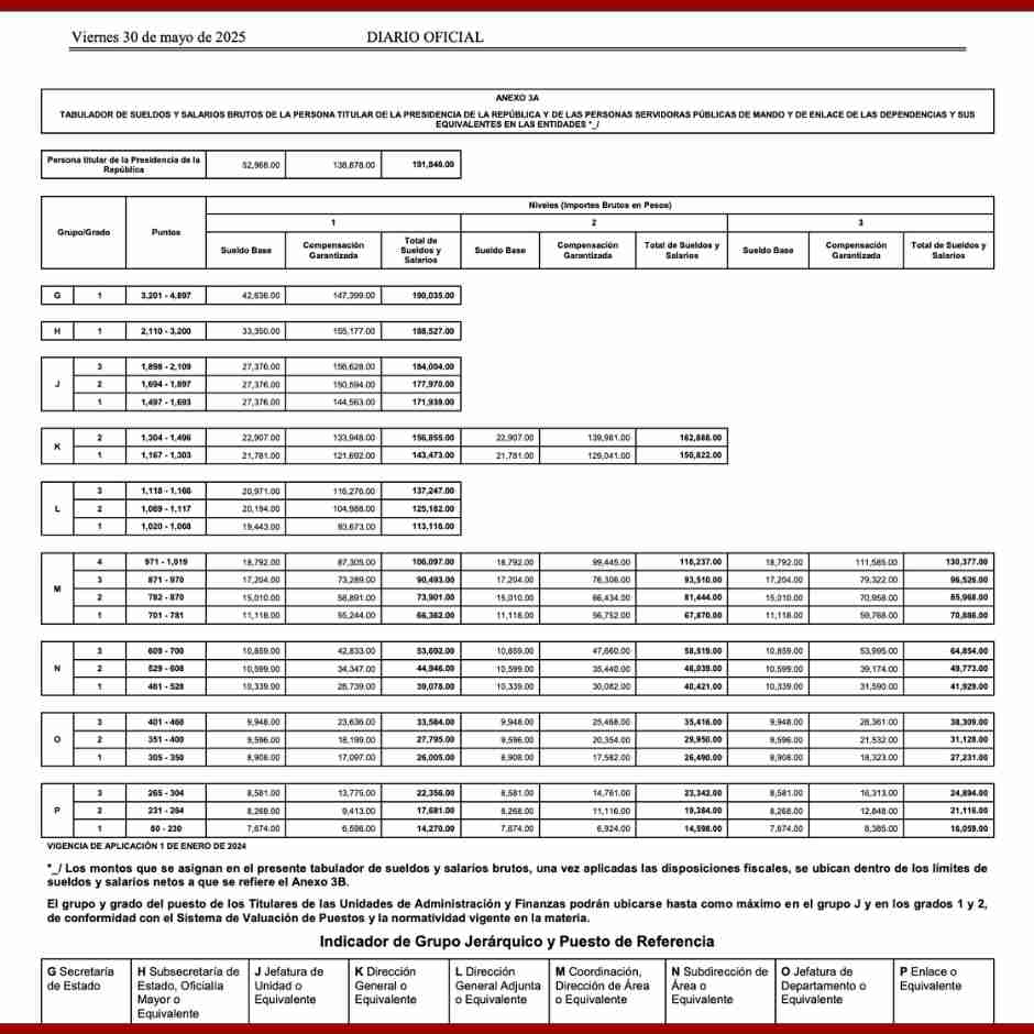 Por ejemplo, en niveles superiores del tabulador el sueldo base puede ubicarse alrededor de los 27 mil pesos mensuales, mientras que la compensación garantizada supera los 140 mil pesos.